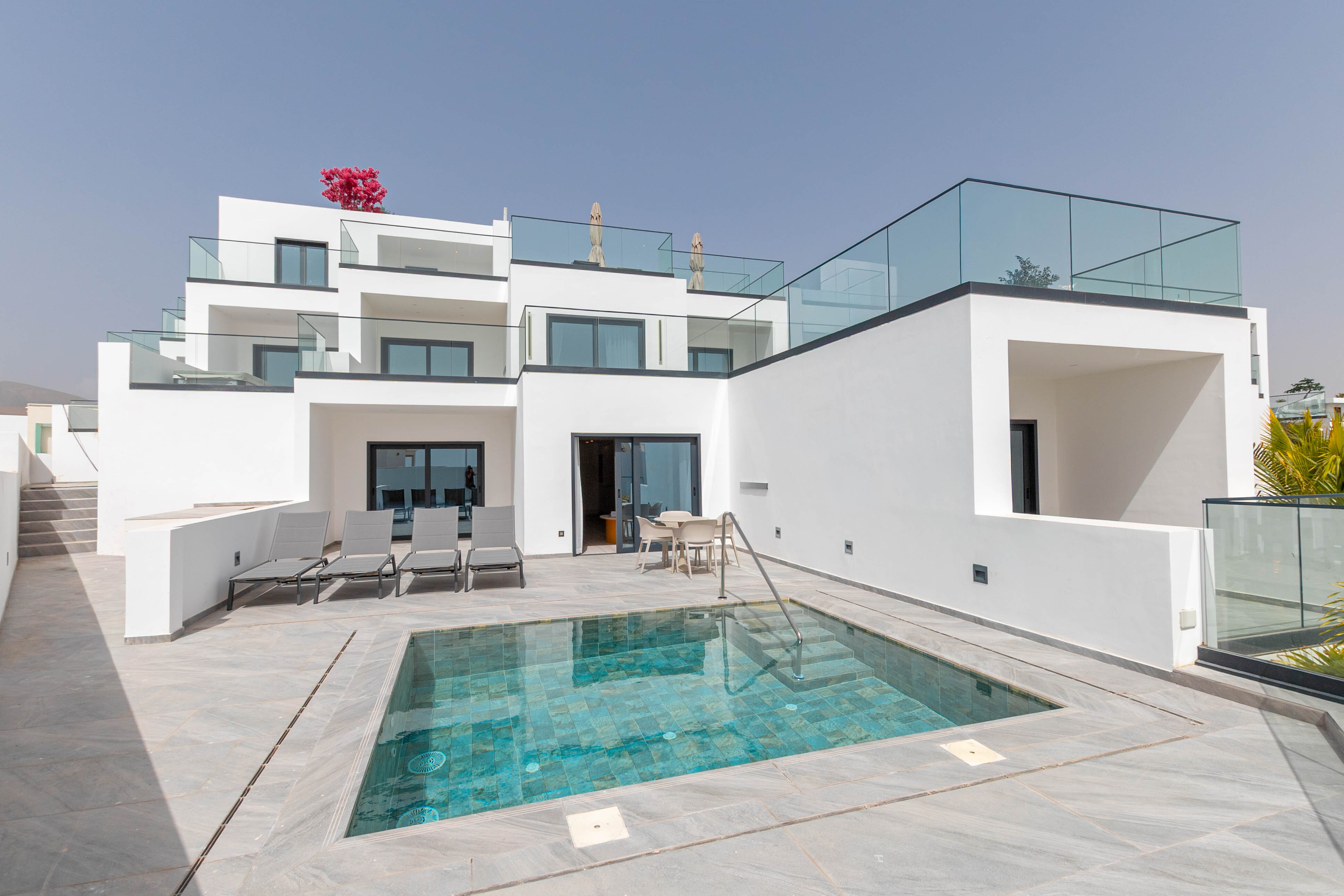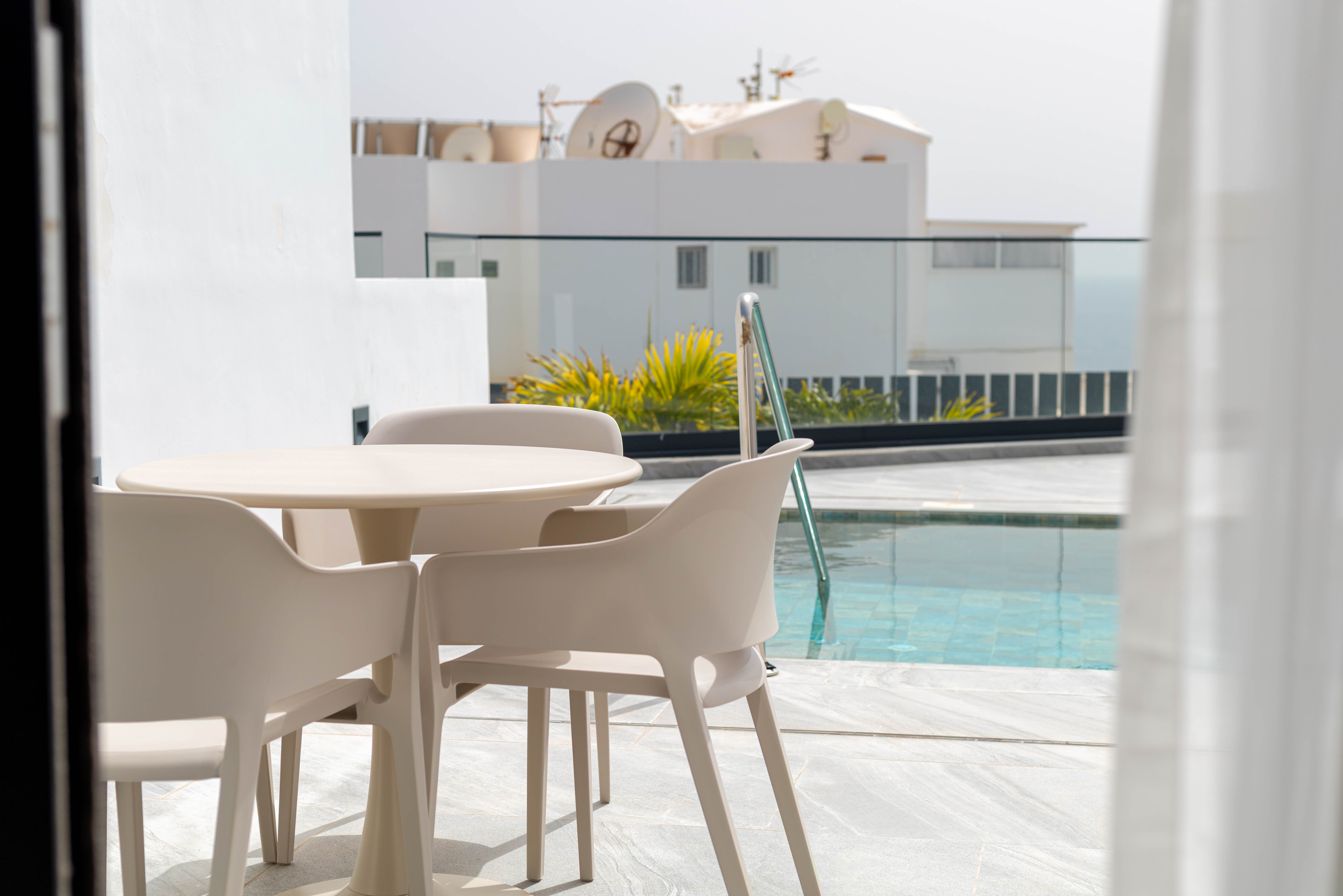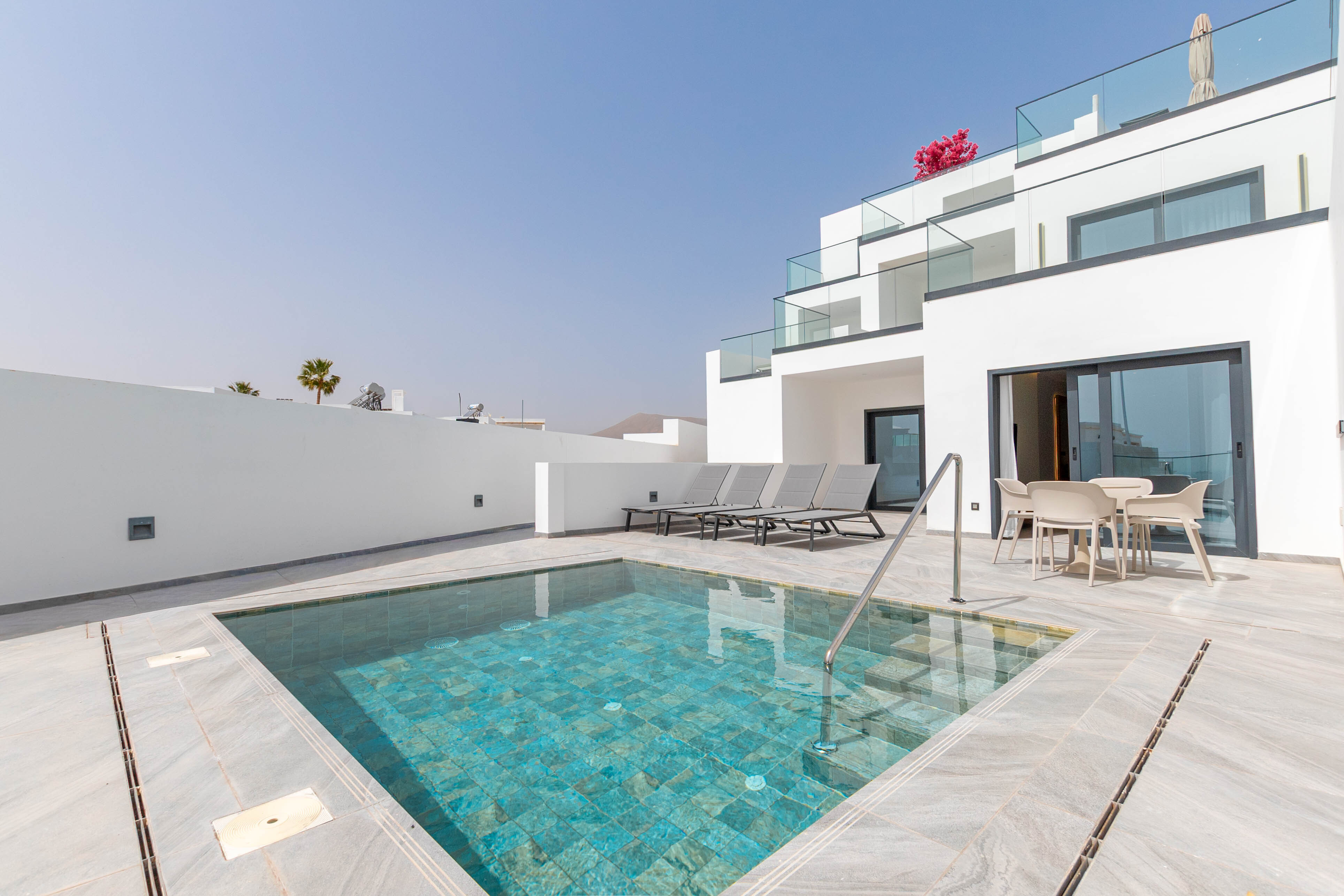 A sanctuary of intimacy and pleasure. The suite opens onto a spacious private terrace with its own pool, where the Lanzarote horizon becomes part of the experience. An exclusive concept that combines luxury, water and serenity at its finest. The terrace, featuring a private pool and partial sea views, offers an elegant setting to relax and enjoy moments of complete privacy. Bathroom with rain shower.