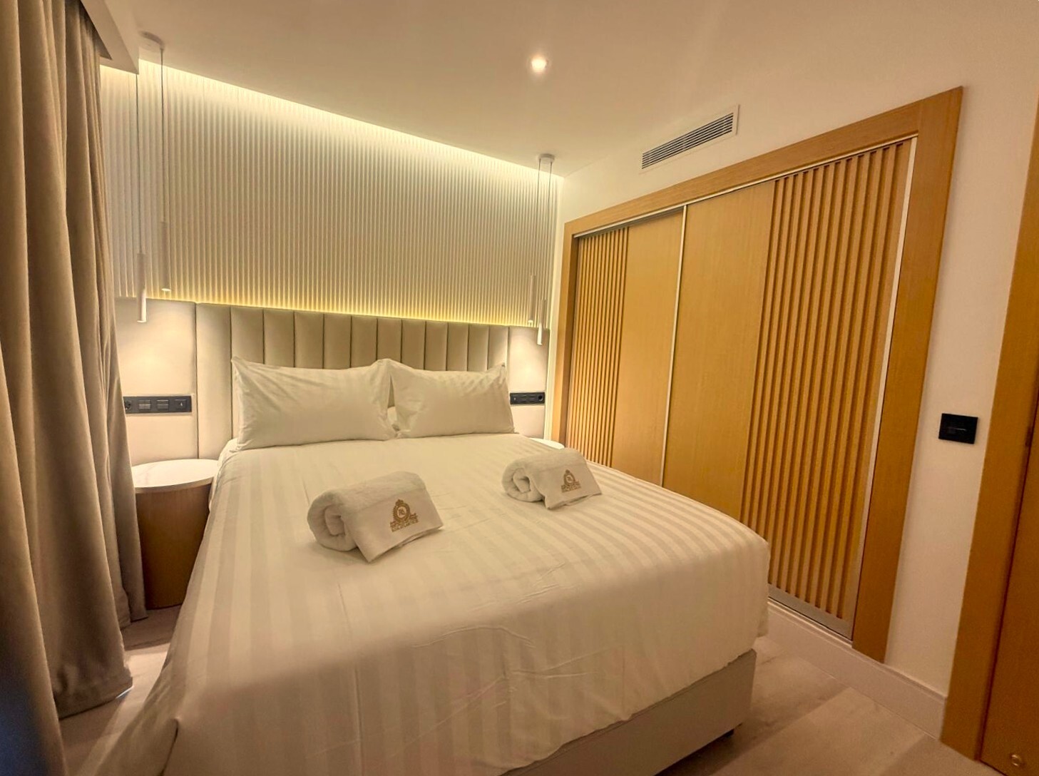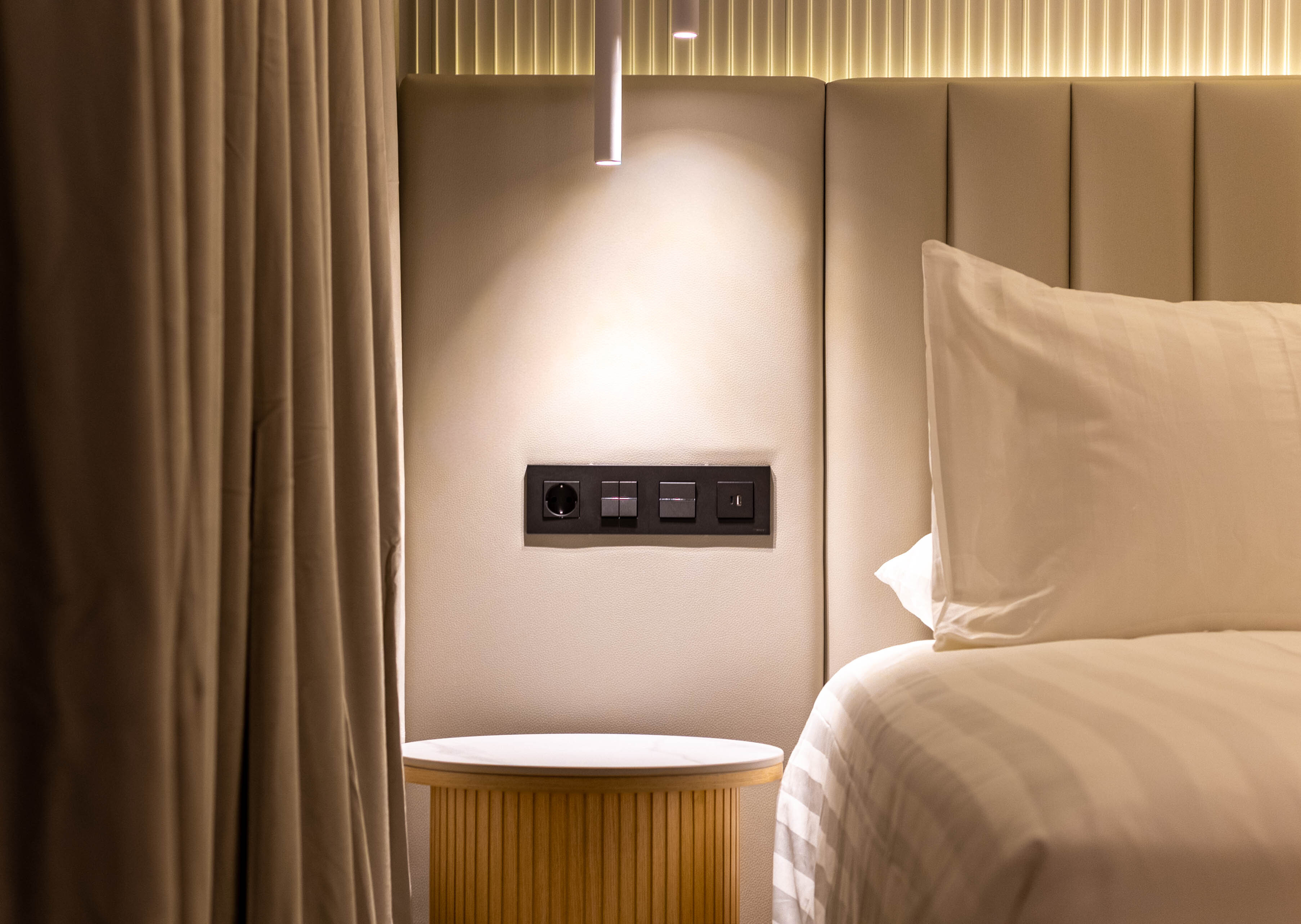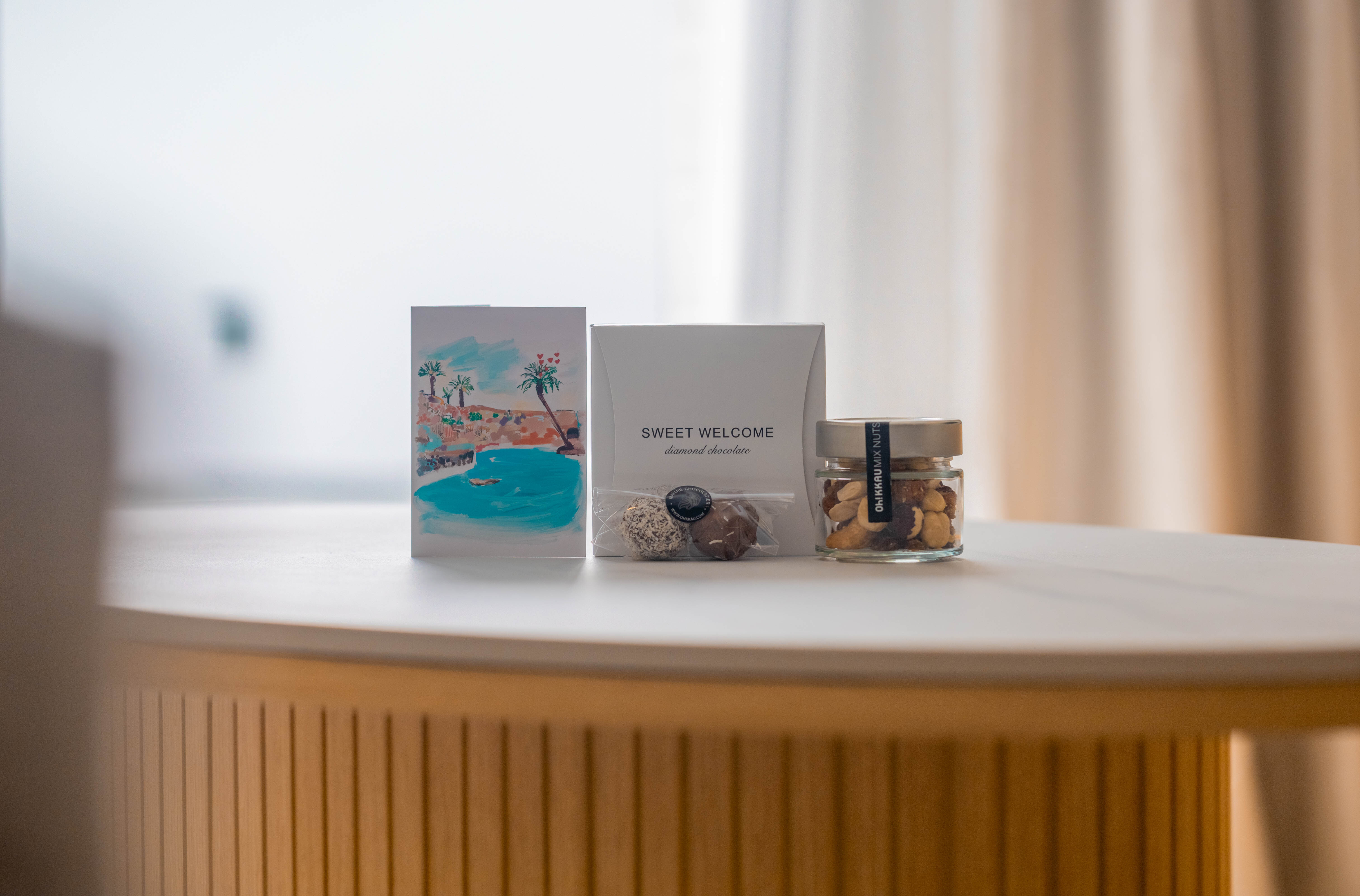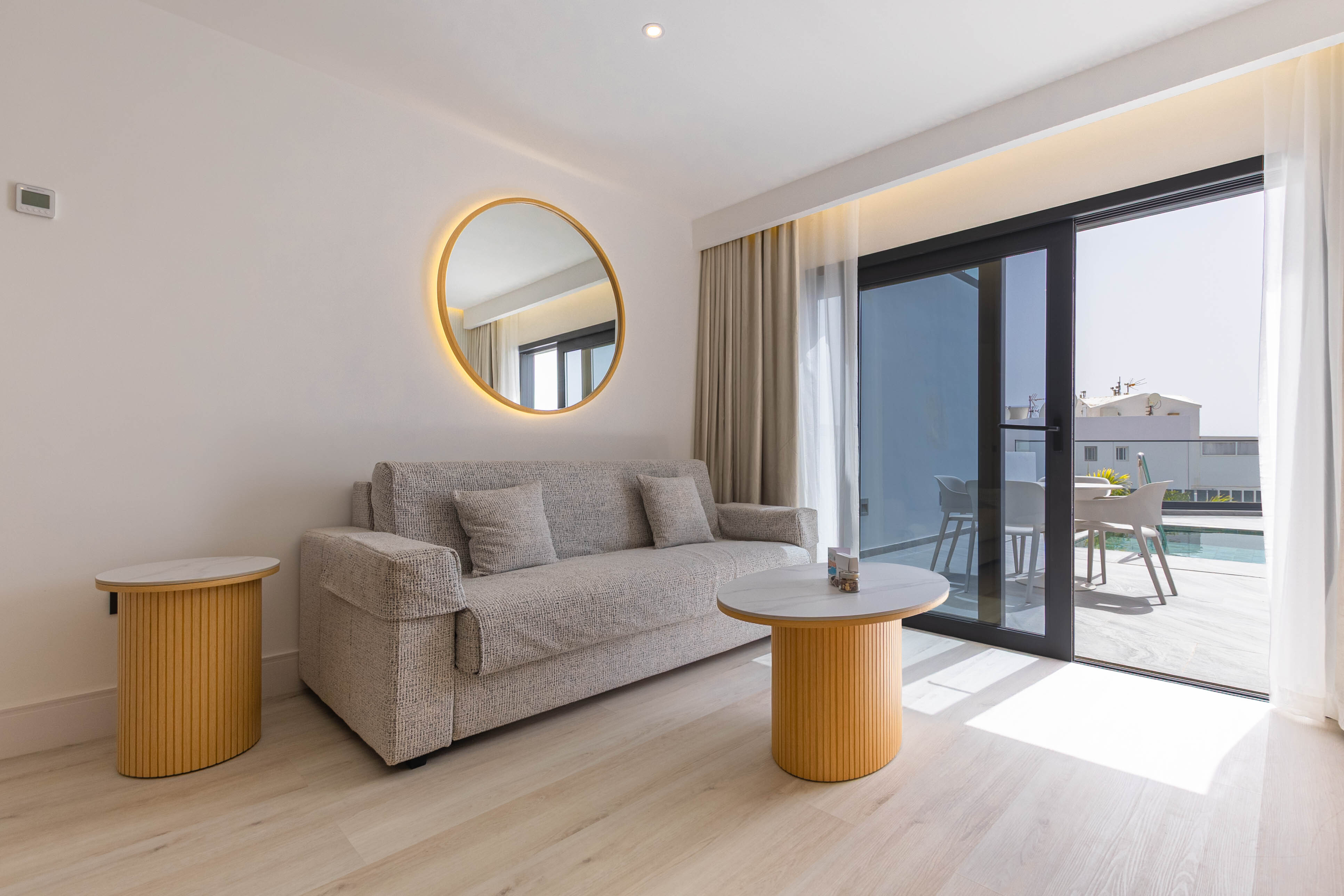 A sanctuary of intimacy and pleasure. The suite opens onto a spacious private terrace with its own pool, where the Lanzarote horizon becomes part of the experience. An exclusive concept that combines luxury, water and serenity at its finest. The terrace, featuring a private pool and partial sea views, offers an elegant setting to relax and enjoy moments of complete privacy. Bathroom with rain shower.