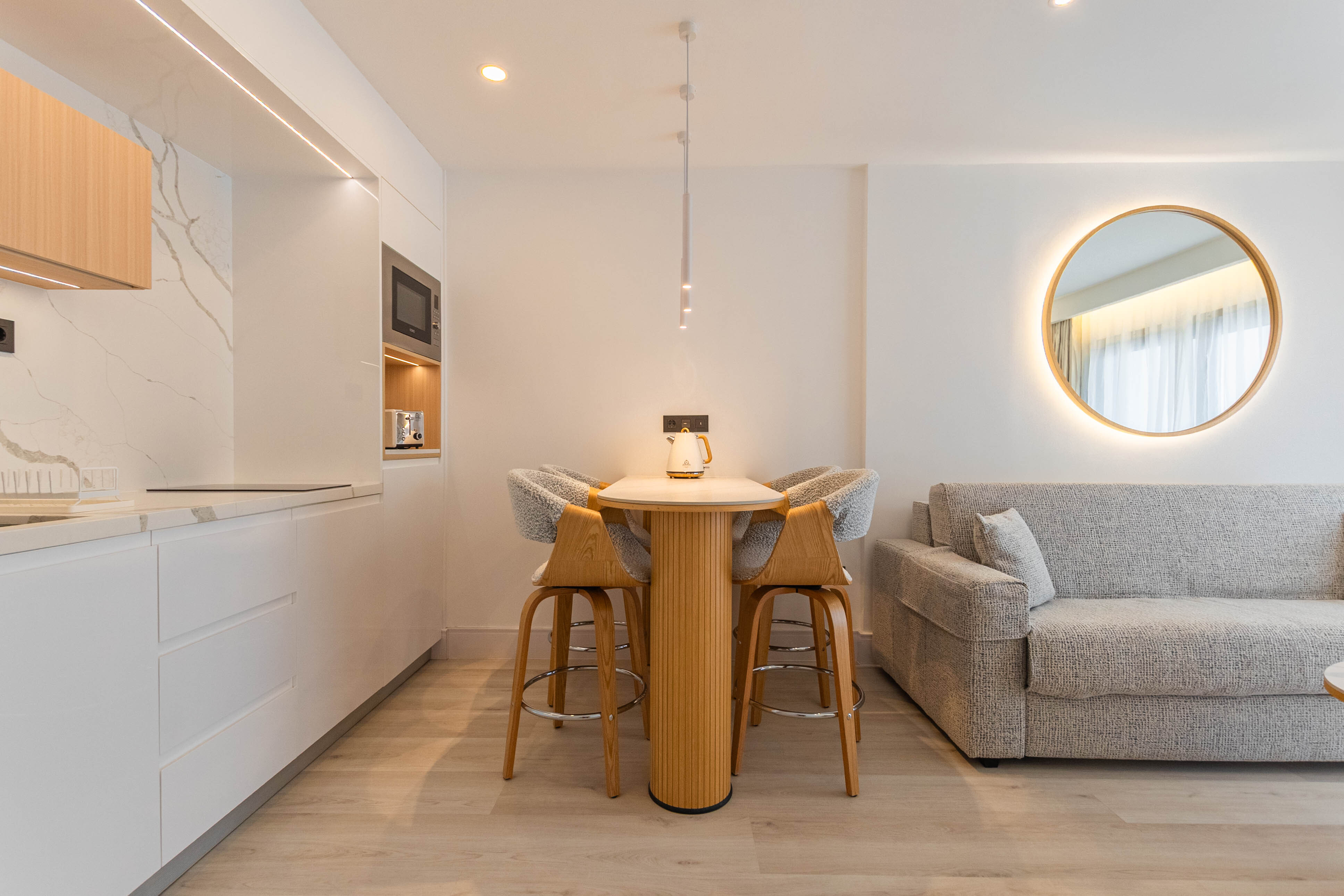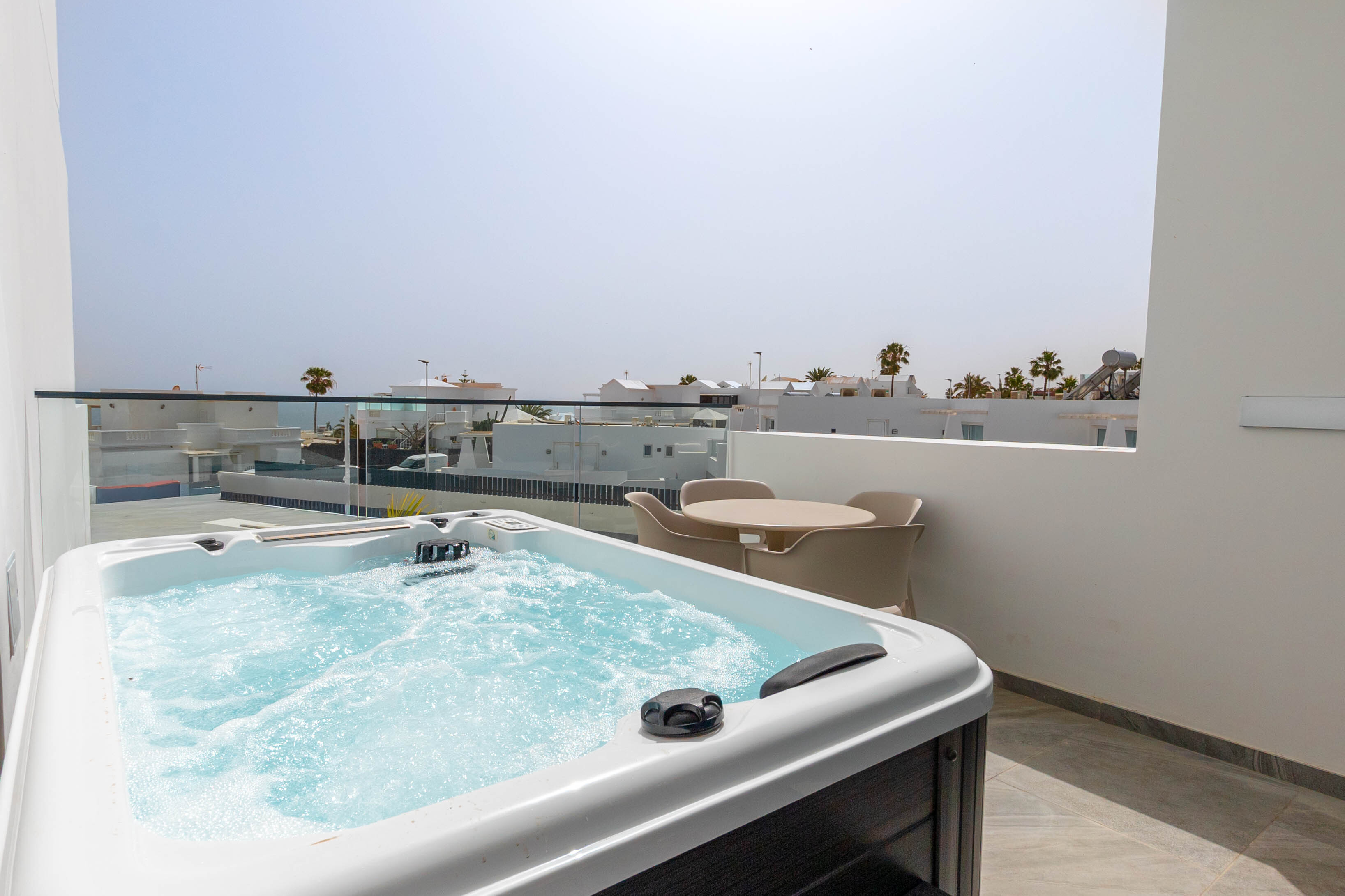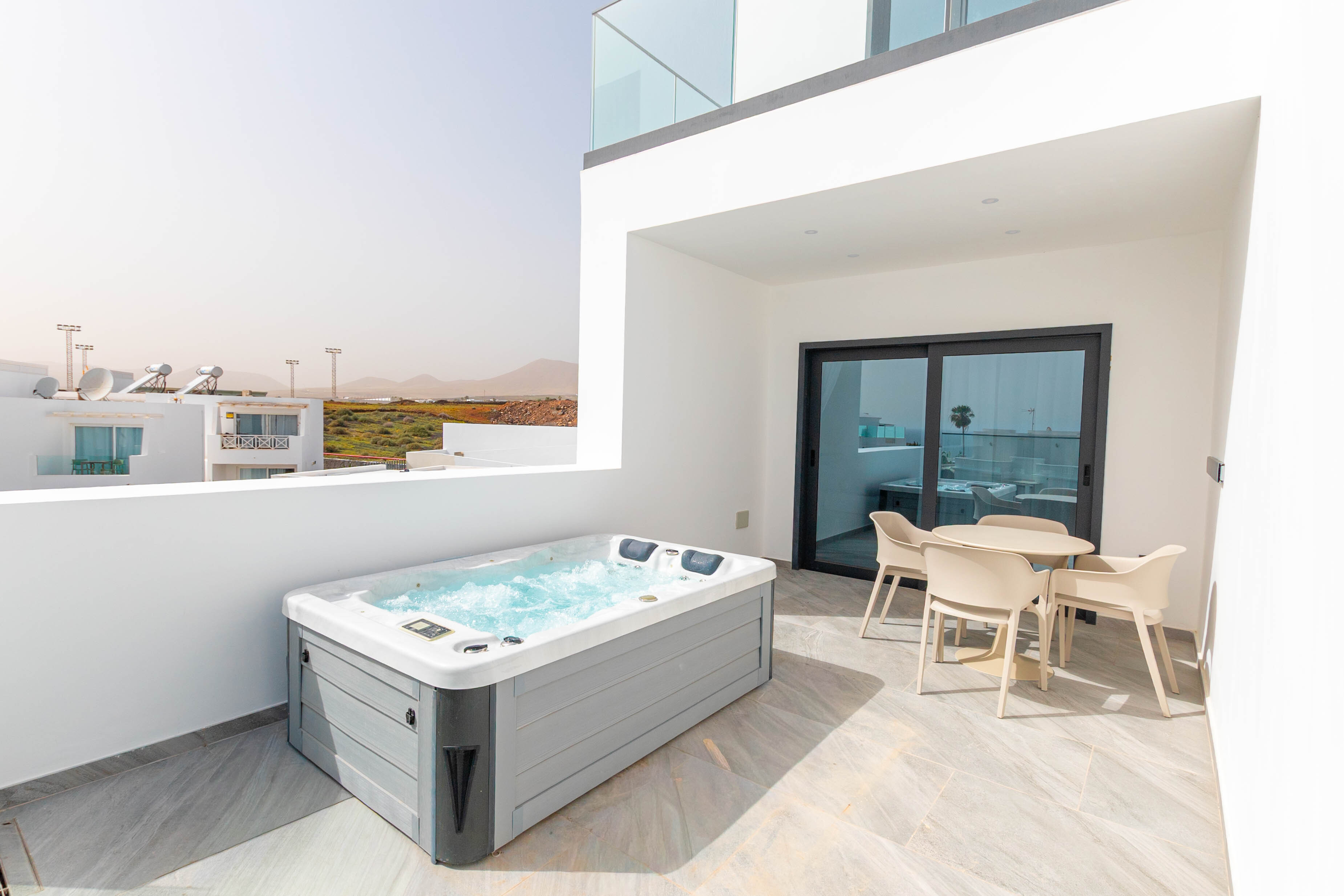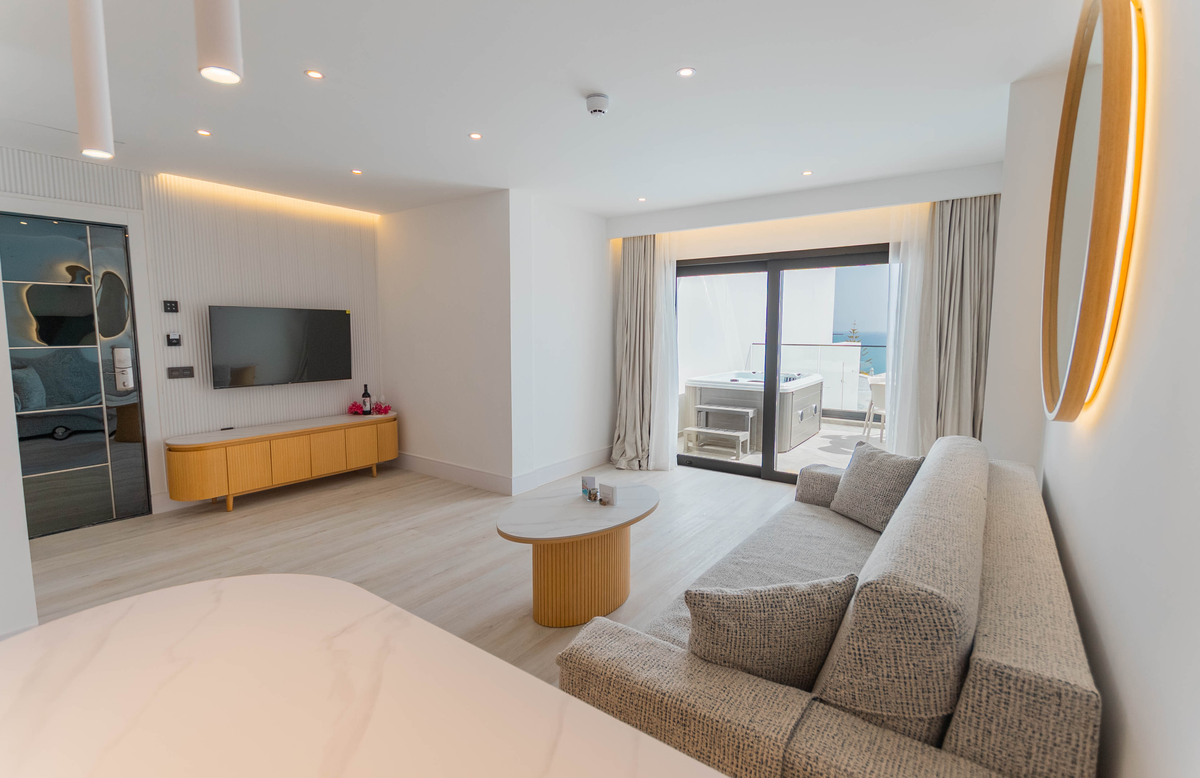 A space created for well-being. Your contemporary-style bedroom opens onto a private terrace with an outdoor jacuzzi, where calm and pleasure meet under the Lanzarote sky. Also offering sea views and balcony or terrace available. Bathroom with rain shower.