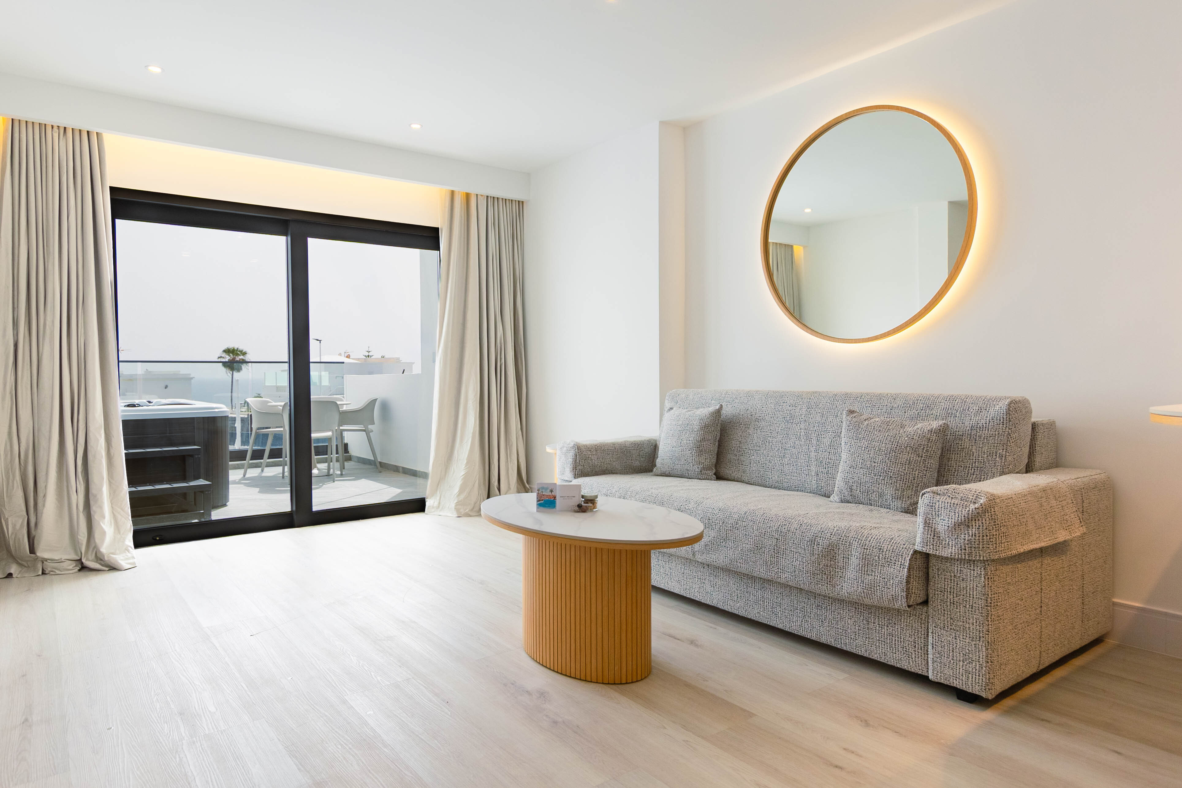 Ideal para familias o grupos que buscan exclusividad. Dos dormitorios elegantes y una terraza equipada con jacuzzi privado. Suite perfecta para relajarse y disfrutar de momentos inolvidables en un entorno sereno. Con vistas al mar, y balcón o terraza disponible. Baño con ducha efecto lluvia.